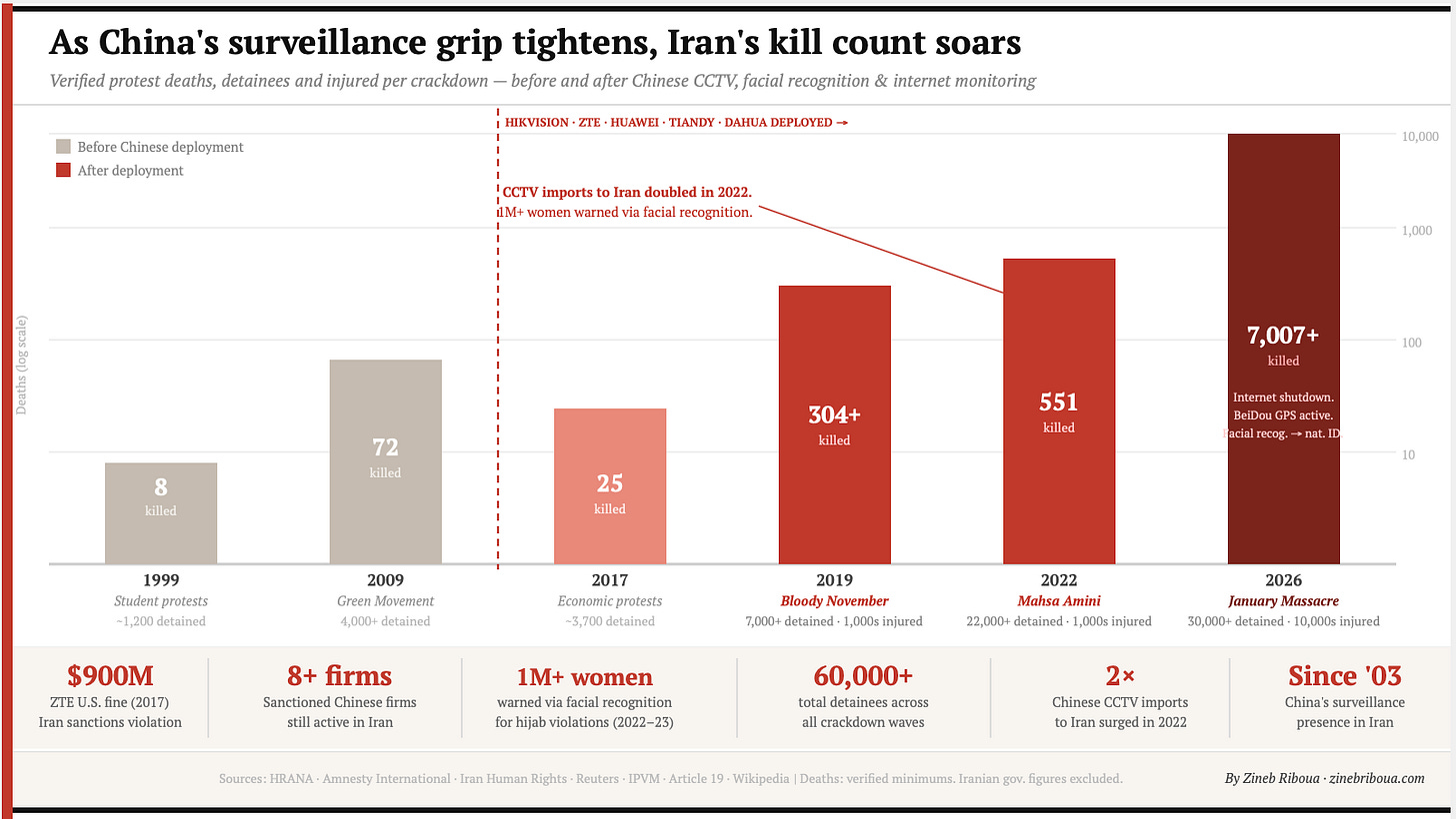 It’s worth noting that Chinese firms supply surveillance infrastructure in at least 150 countries, from camera networks in Vietnam to citywide monitoring systems in Kenya, even in Gulf countries, and the failure of that architecture to stabilize the Iranian state under military and informational pressure sends a signal to every government that purchased the same system and the same promise of durable control.