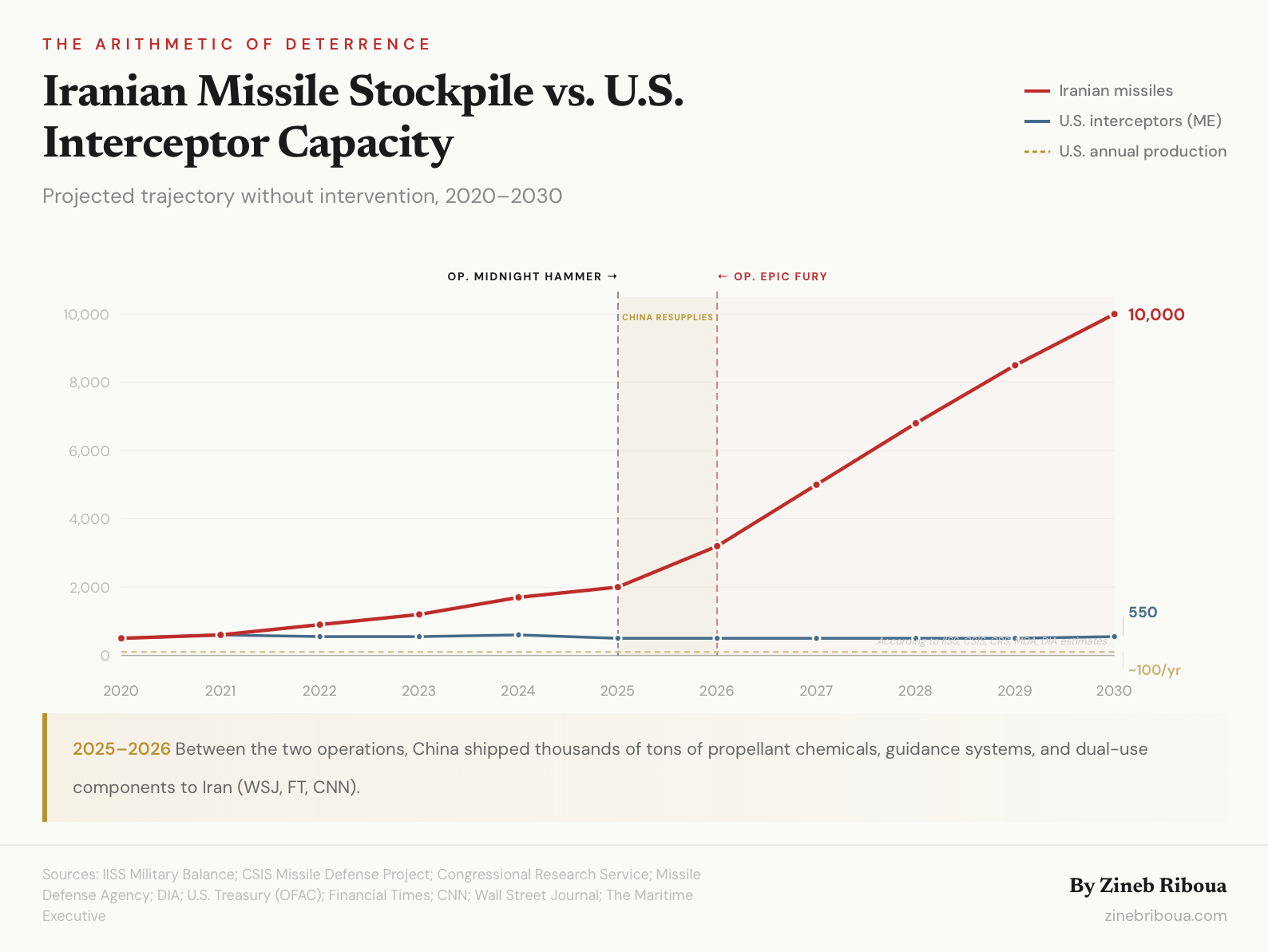 By the time Operation Epic Fury launched, Iran possessed the largest ballistic missile arsenal in the Middle East, an estimated 2,000 missiles of varying ranges dispersed across hardened underground facilities, rebuilt and resupplied in large part by Chinese industrial networks.